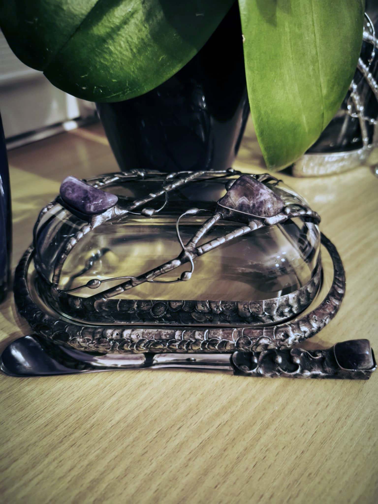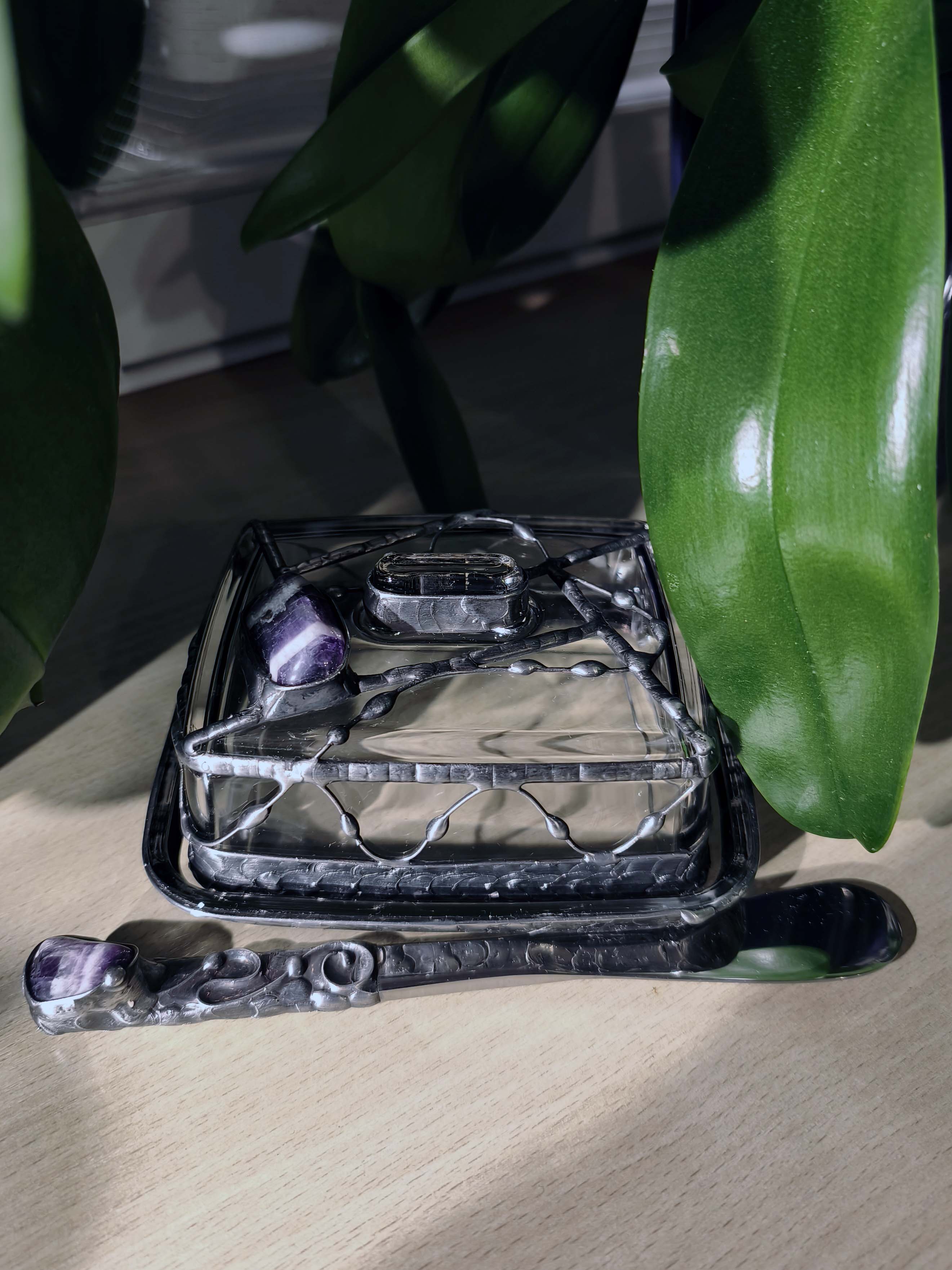 Maselniczka z ametystem. Melniczka szklana. Wymiary maselniczki: góra 125 mm x 95 mm, dół 170 mm x 110 mm, wysokość 95 mm. Ametyst, drut i blacha miedziana, cyna. Nóż stalowy AMBITION o długości 190 mm. Kamień ametyst. #Autorski, #praktyczny #prezent na każdą okazję.